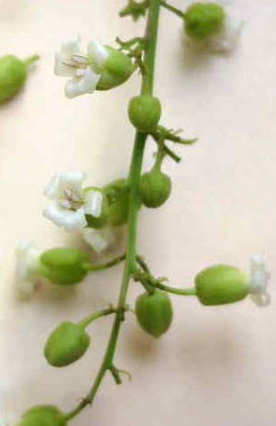 Flowers: Inflorescence axillary, flowers on a branched axis, cones absent; flowers bisexual, stalked, flowers with many planes of symmetry, 7.0-9.0 mm long, diameter small (up to10 mm diam.); perianth present, with distinct sepals and petals whorls, inner perianth greenish white or green; 5, some or partly joined; stamens 5, present, free of each other, free of the perianth; ovary superior, carpels joined (when more than one), locules 2; styles solitary, 1.