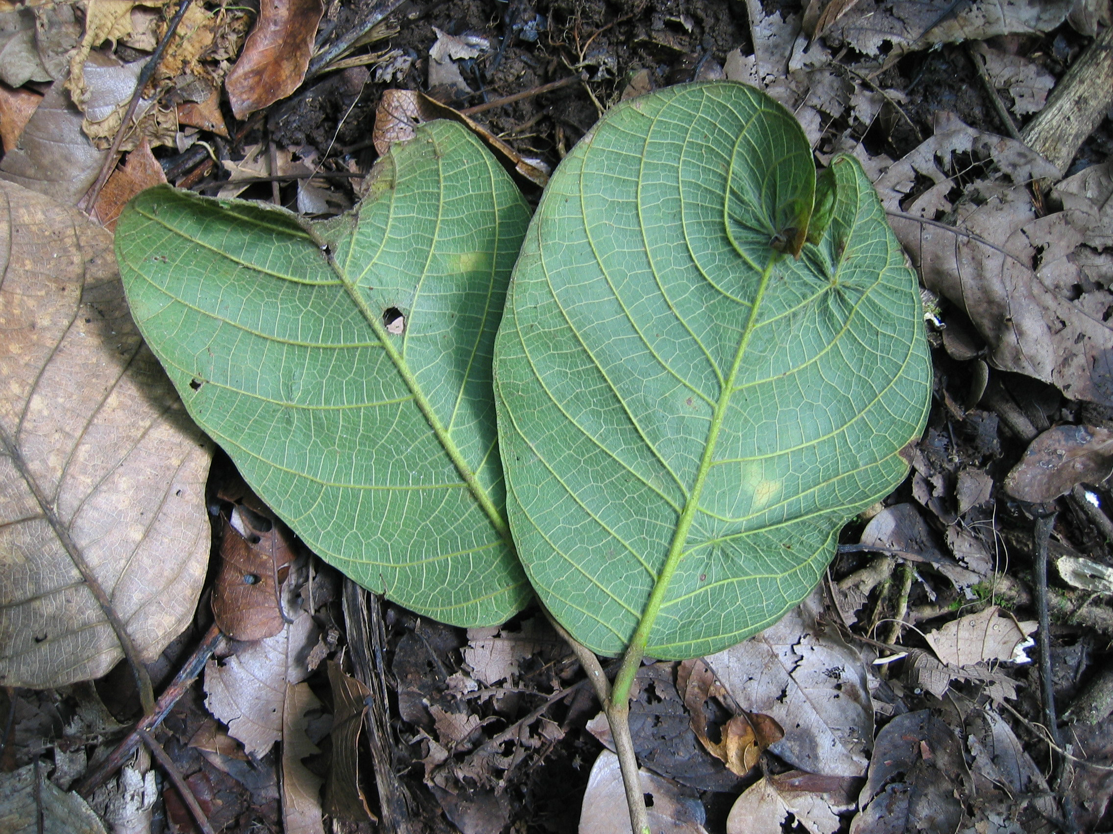 Leaves: Leaves spaced along branches, spiral (leaves occurring singly at a node and arranged spirally up the branchlet), simple (a leaf composed of a single blade); petiole present, not winged, attached to base of leaf blade, swollen; leaves broadest at or near middle, 10.0-21.0 cm, 4.5-14.0 cm; symmetric, entire, not dissected or lobed, acuminate, venation pinnate, secondary veins open, prominent, intramarginal veins absent; leaves lower surface dull green, upper surface green (glossy), indumentum (hairs) present, indumentum (hairs) dense; absent; domatia absent; stipules present, free, laterally placed, not encircling the twig, leafy, not fringed, large (6-10 mm long), not persistent.